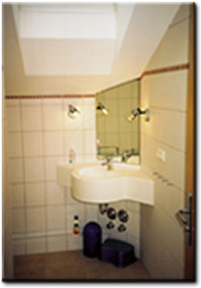 Das Badezimmer ist mit einer Dusche ausgestattet und hat ein großes, elektrisch zu bedienendes Dachflächenfenster.